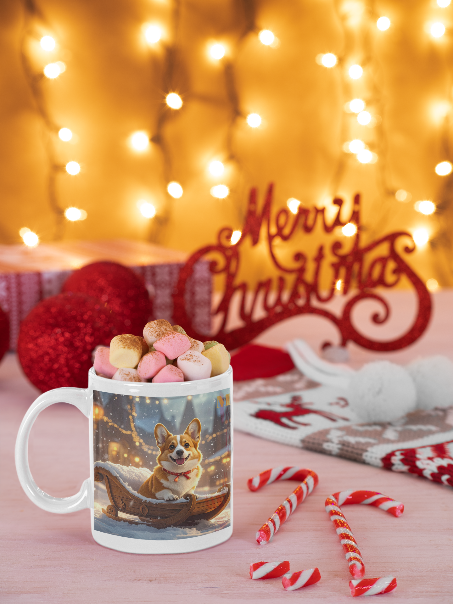 Ezen a prémium minőségű bögrén részletgazdag Corgi illusztráció látható egy hangulatos karácsonyi háttérrel, ami egyedi és barátságos megjelenést ad.