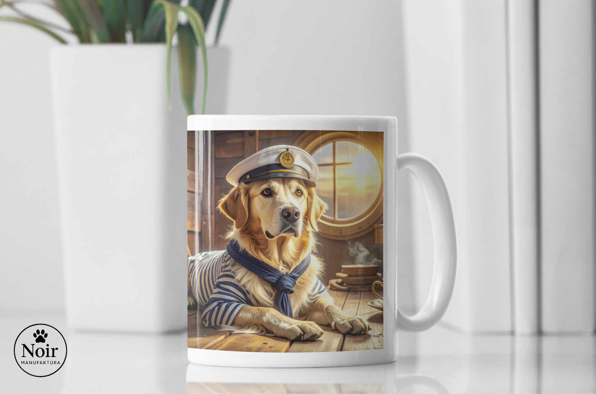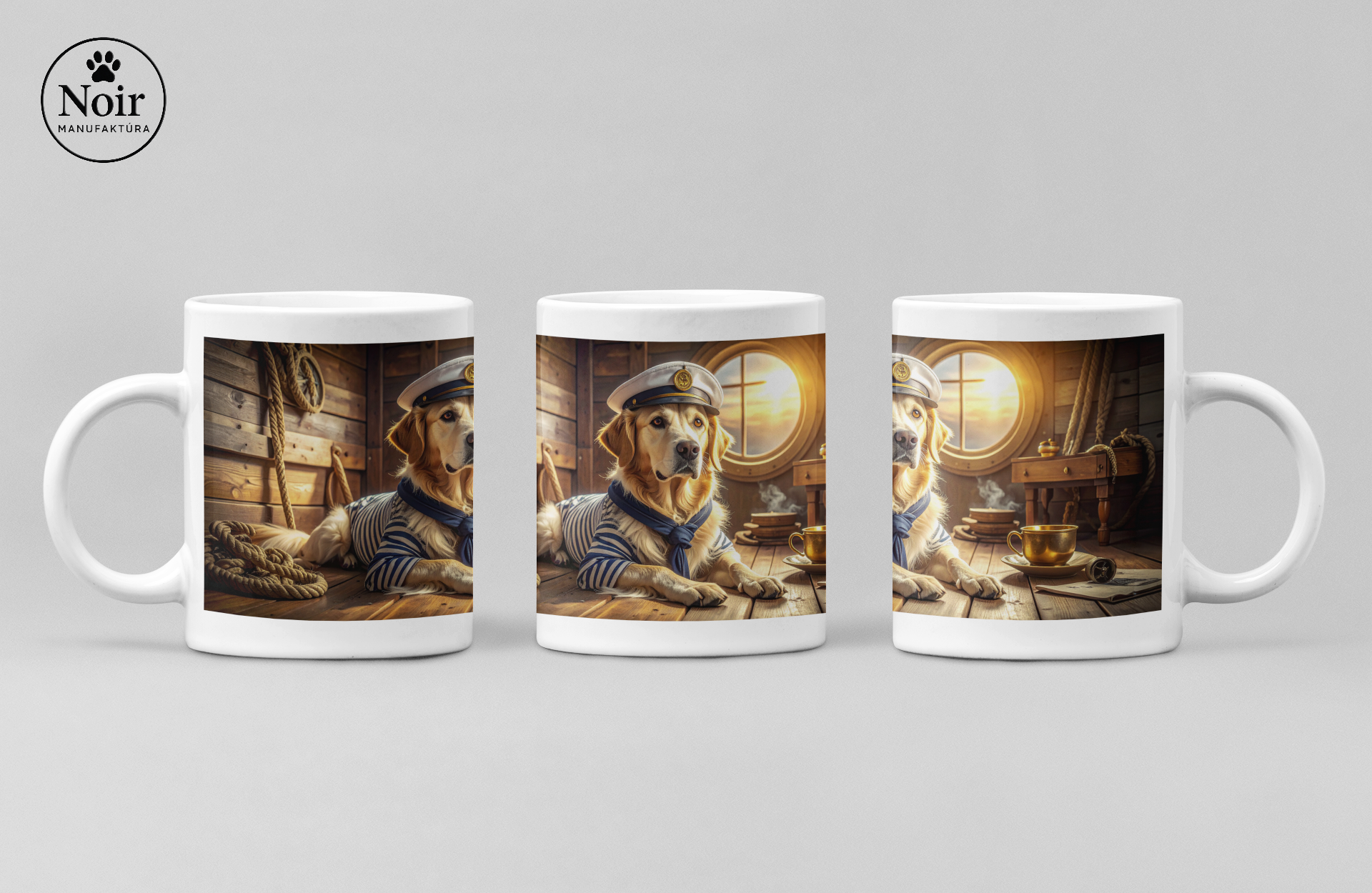 Ezen a prémium minőségű bögrén részletgazdag golden retriever illusztráció látható egy tengeri hajó háttérrel, ami egyedi és barátságos megjelenést ad.