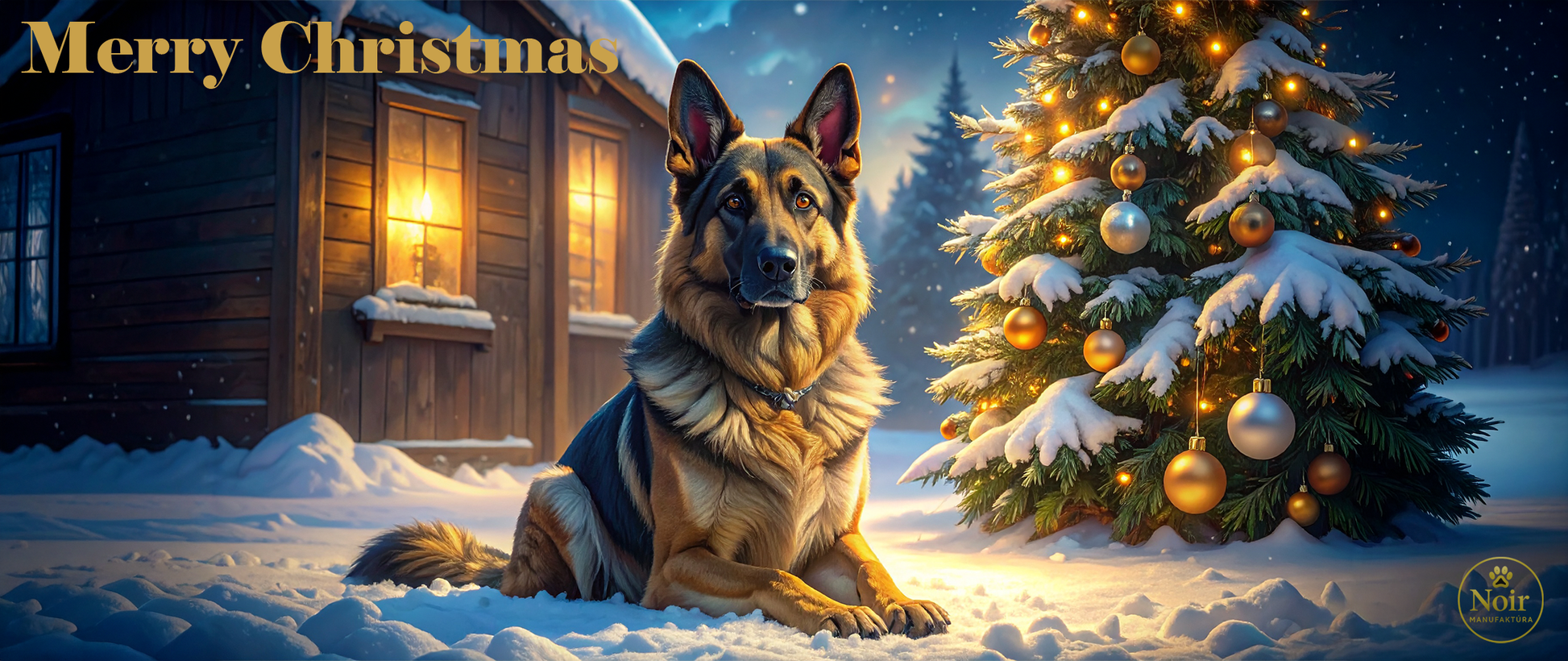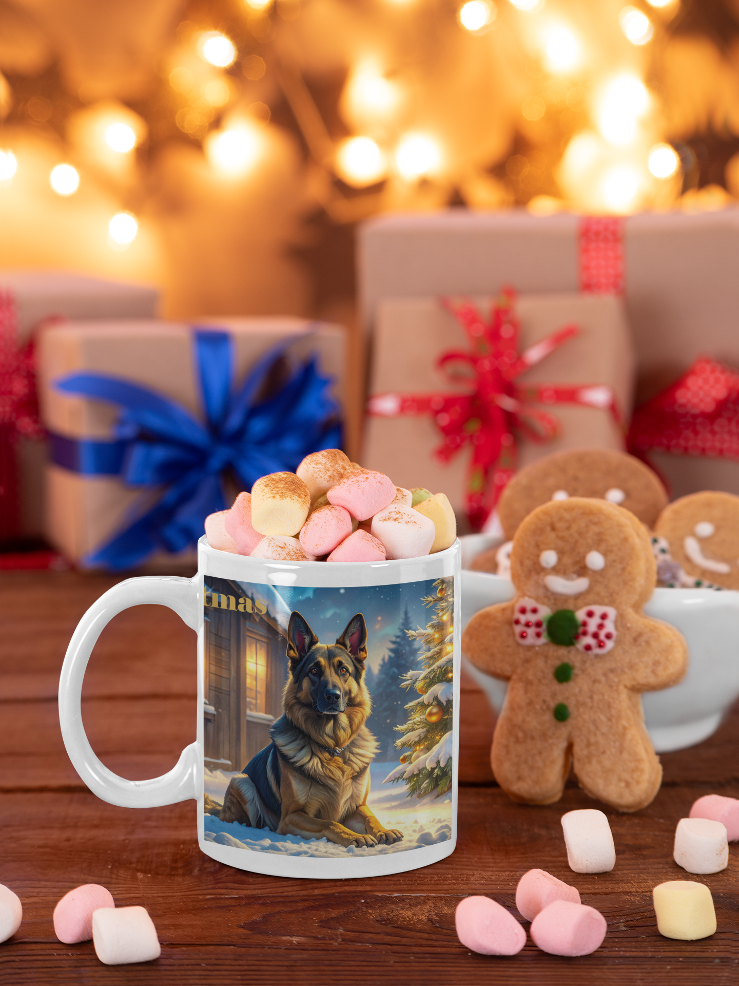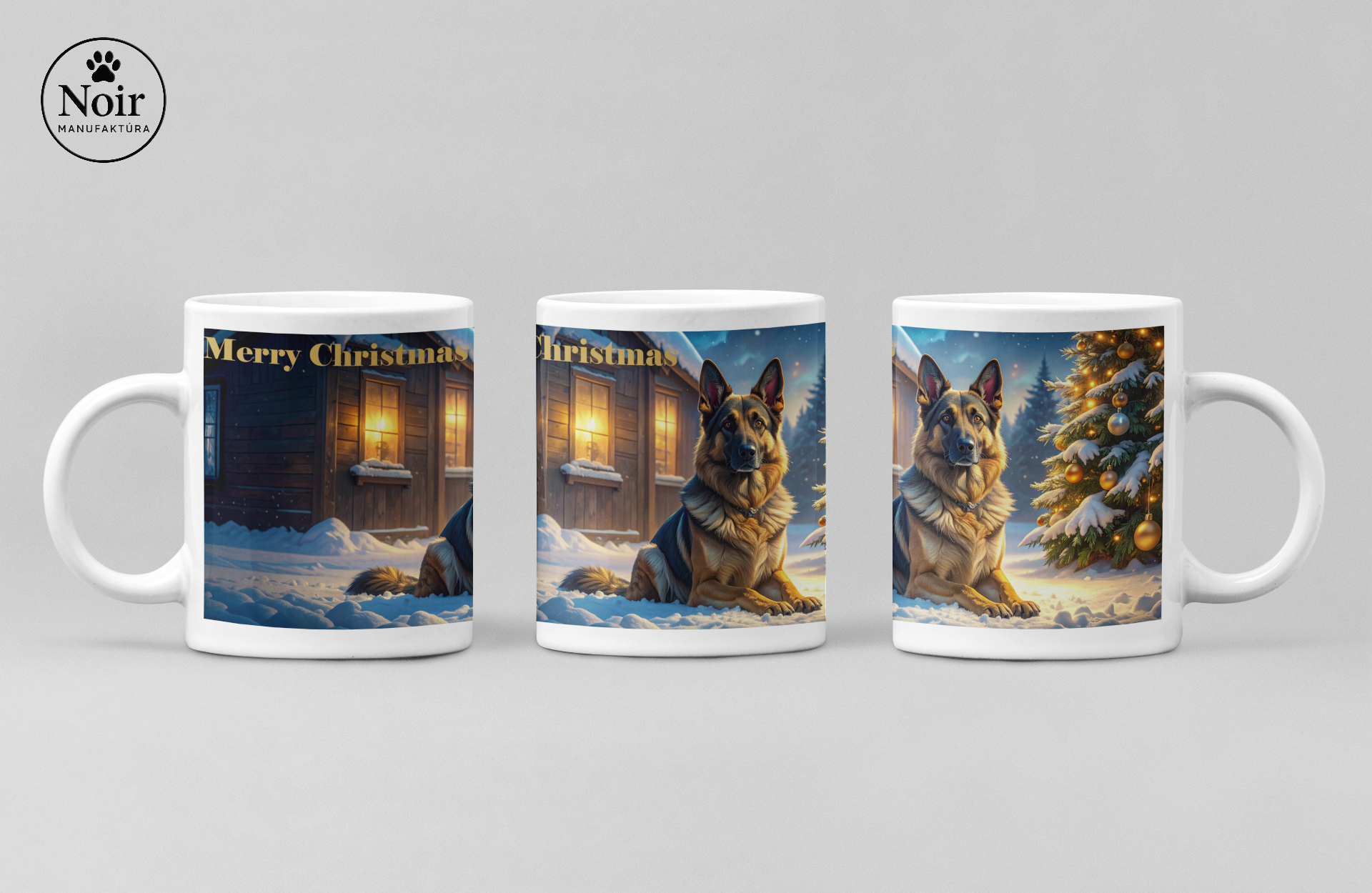 Ezen a prémium minőségű bögrén részletgazdag Németjuhász illusztráció látható egy hangulatos karácsonyi háttérrel, ami egyedi és barátságos megjelenést ad.