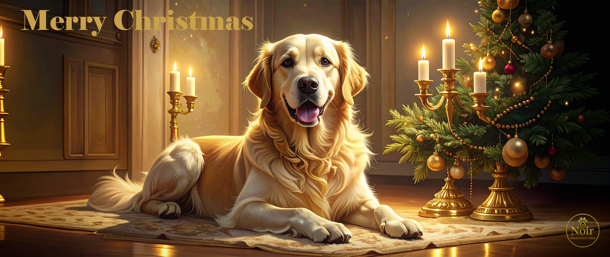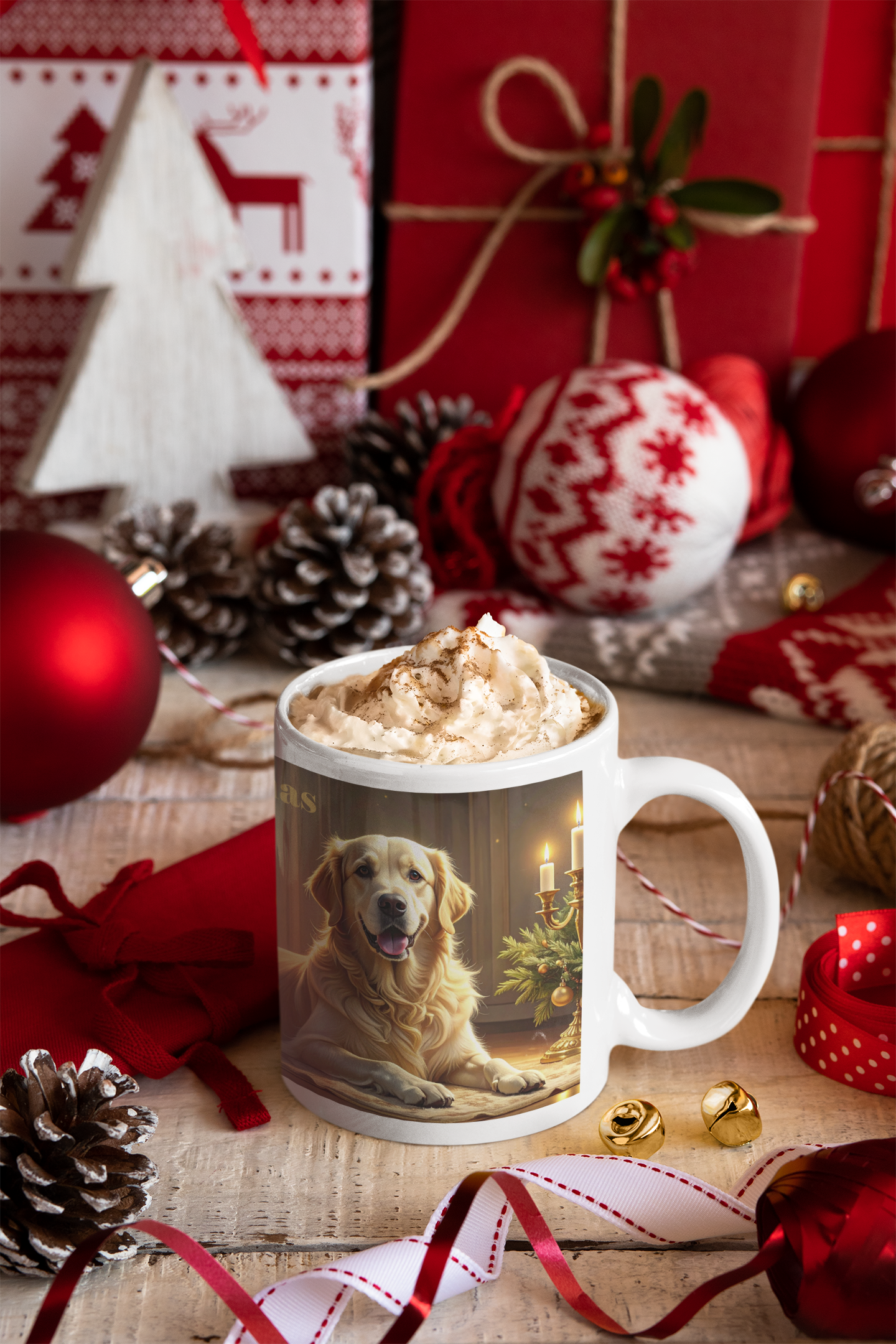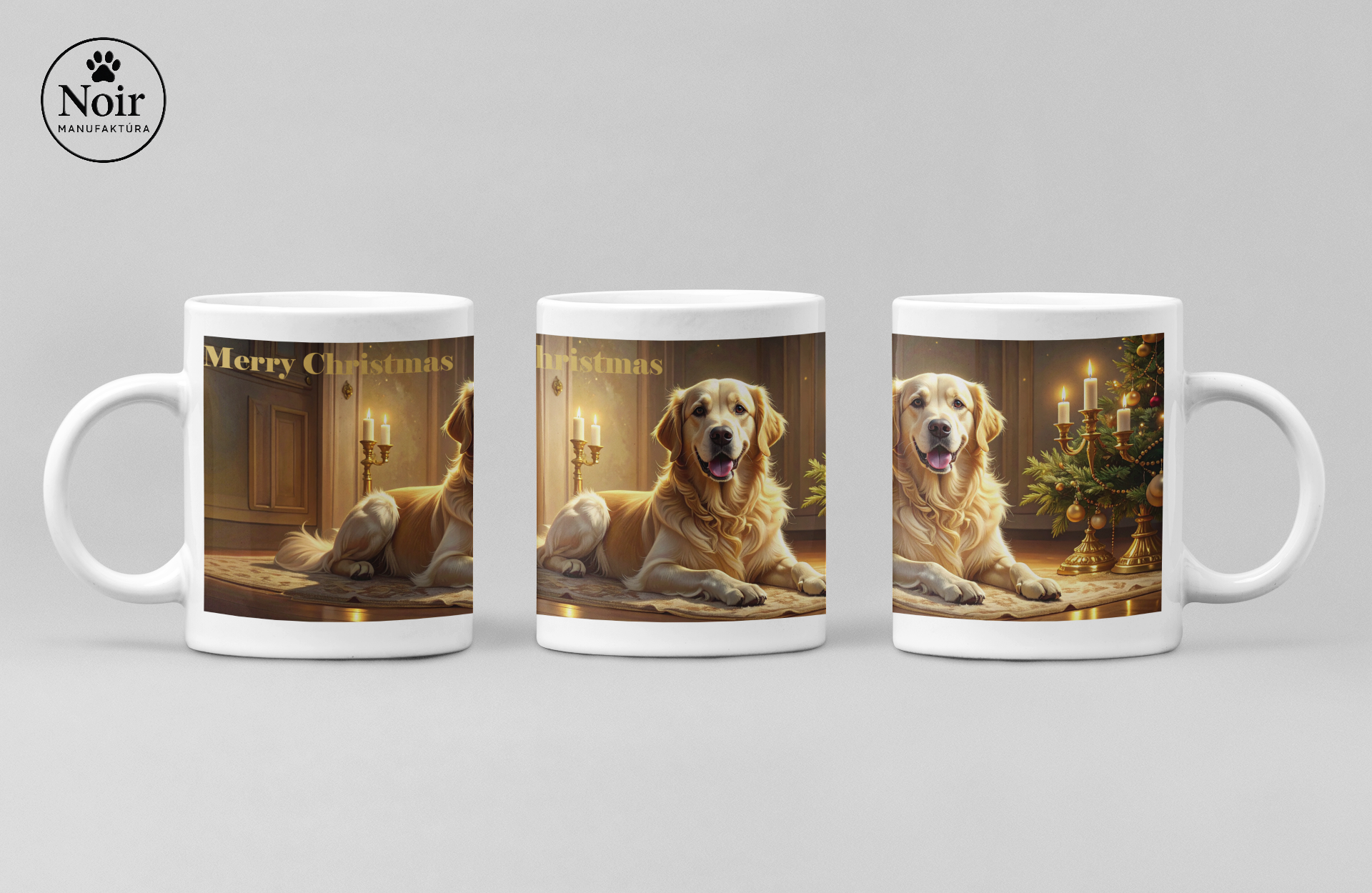 Ezen a prémium minőségű bögrén részletgazdag Golden Retriever illusztráció látható egy hangulatos karácsonyi háttérrel, ami egyedi és barátságos megjelenést ad.