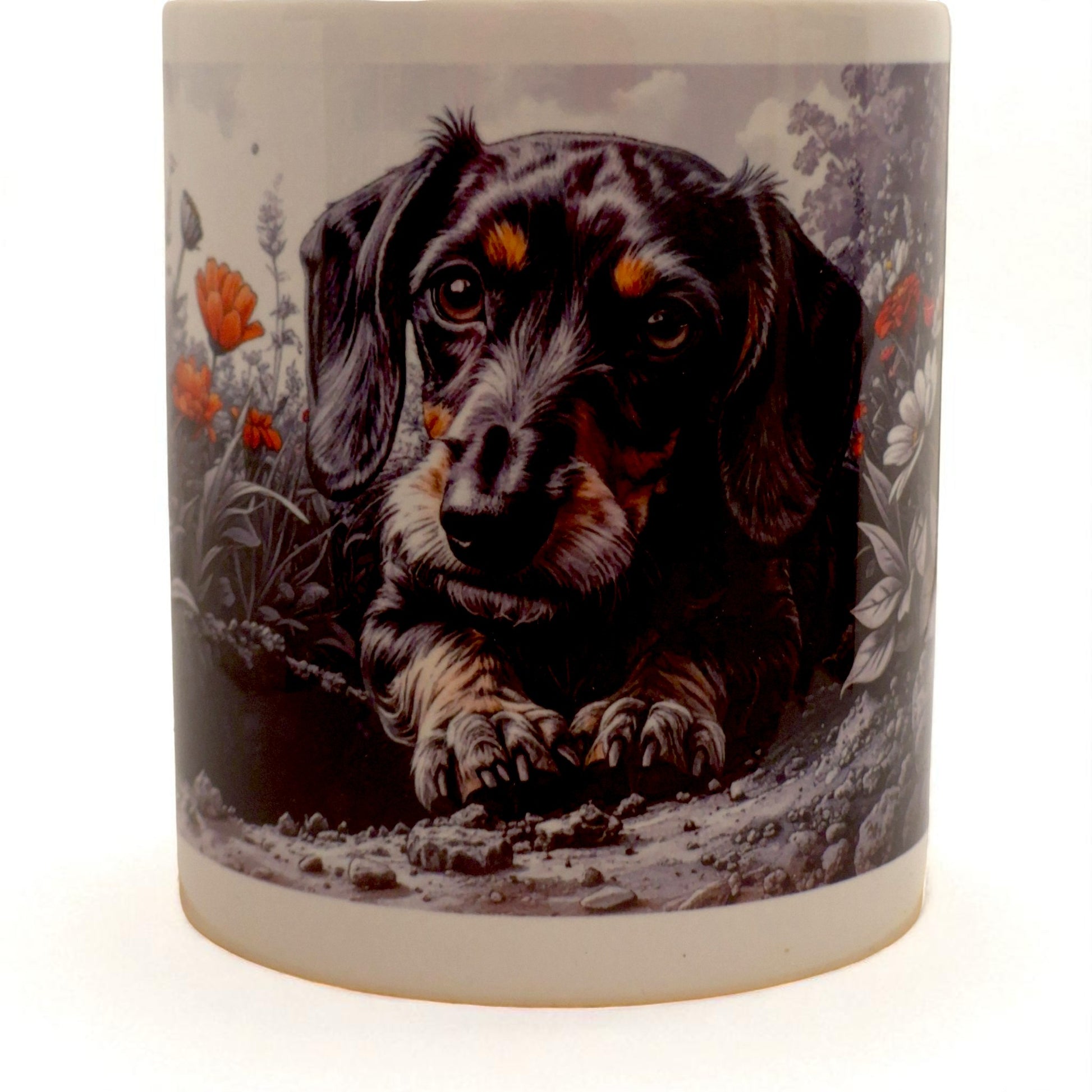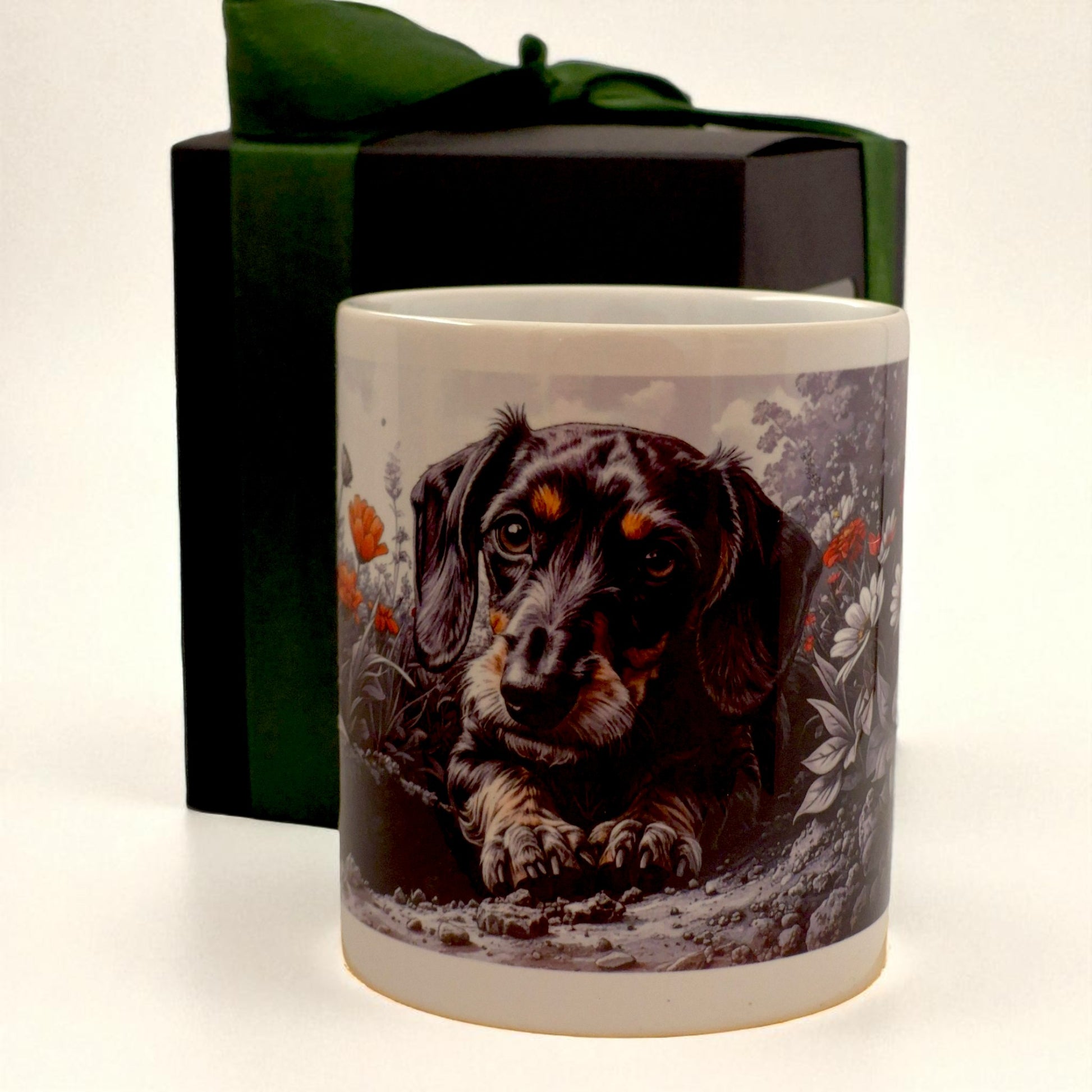 Ez a prémium minőségű bögre igazi különlegesség: elegáns, kraft díszdobozban érkezik, sötétzöld szalaggal átkötve – így azonnal ajándékozható. A bögrén részletgazdag drótszőrű tacskó illusztráció látható virágos háttérrel, ami egyedi és barátságos megjelenést ad.