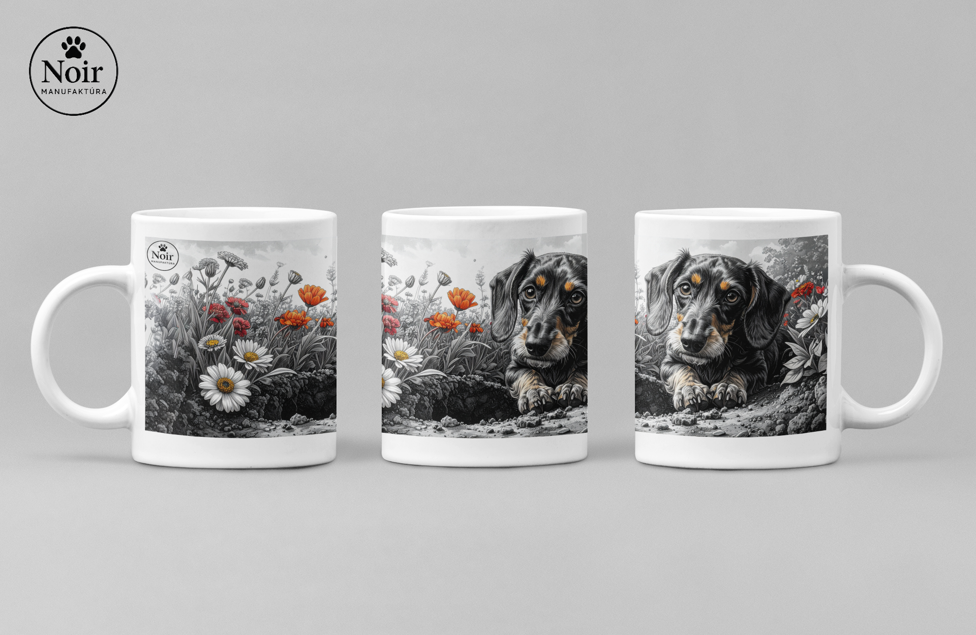 Ezen a prémium minőségű bögrén részletgazdag drótszőrű tacskó illusztráció látható virágos háttérrel, ami egyedi és barátságos megjelenést ad.