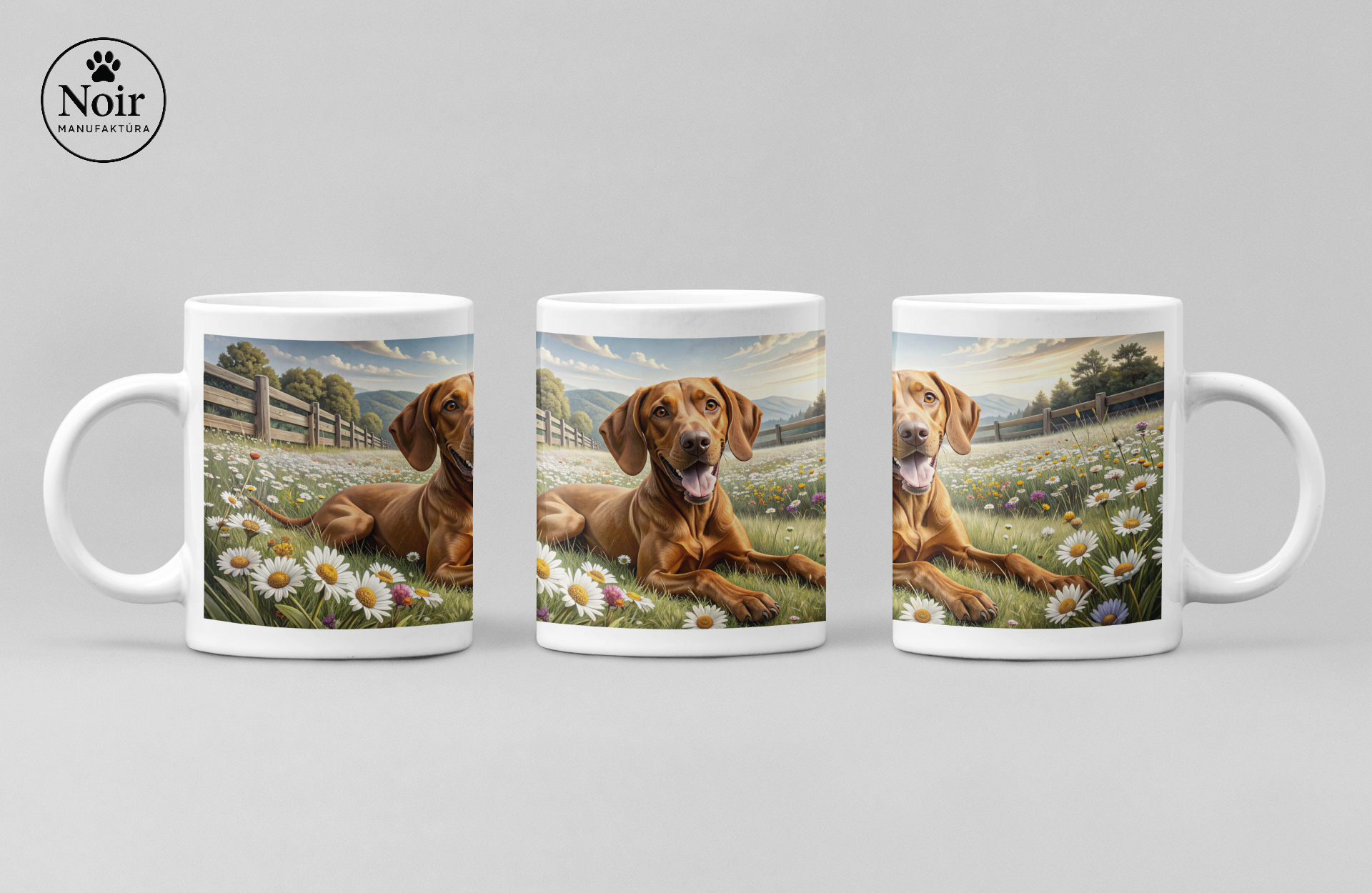 Ezen a prémium minőségű bögrén részletgazdag vizsla illusztráció látható egy szép rétet ábrázoló háttérrel, ami egyedi és barátságos megjelenést ad.