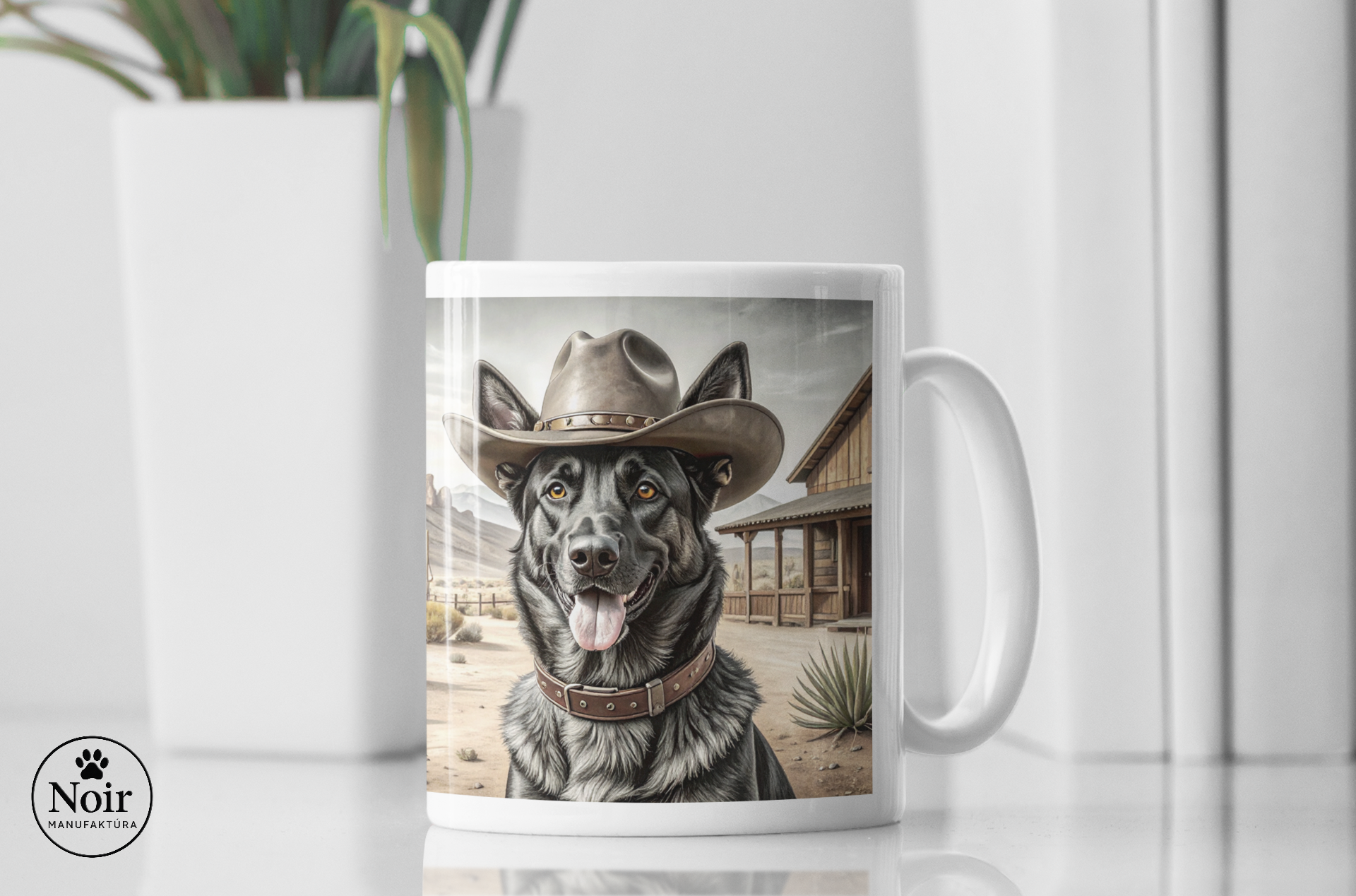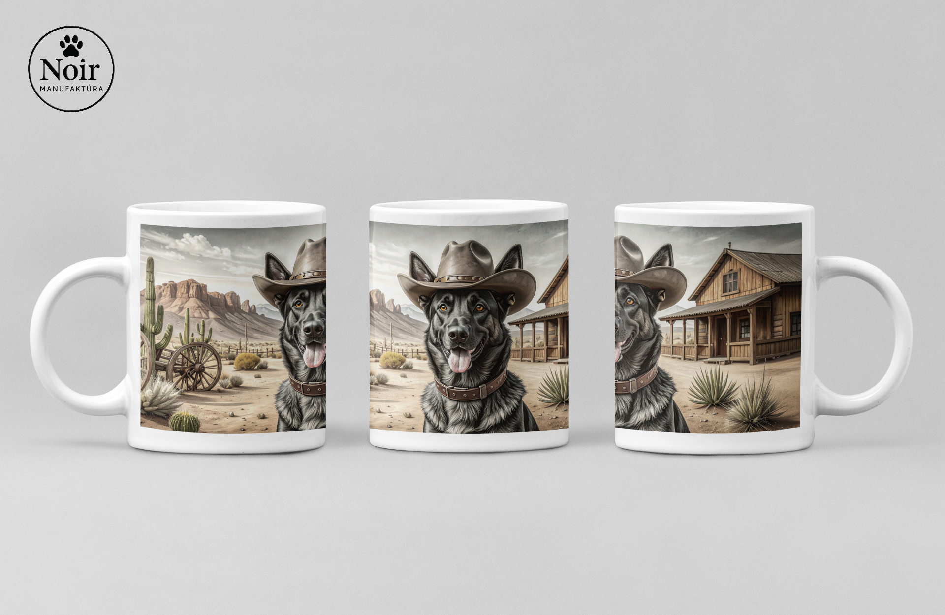 Ez a prémium minőségű bögre igazi különlegesség! A bögrén részletgazdag németjuhász illusztráció látható egy western háttérrel, ami egyedi és barátságos megjelenést ad.