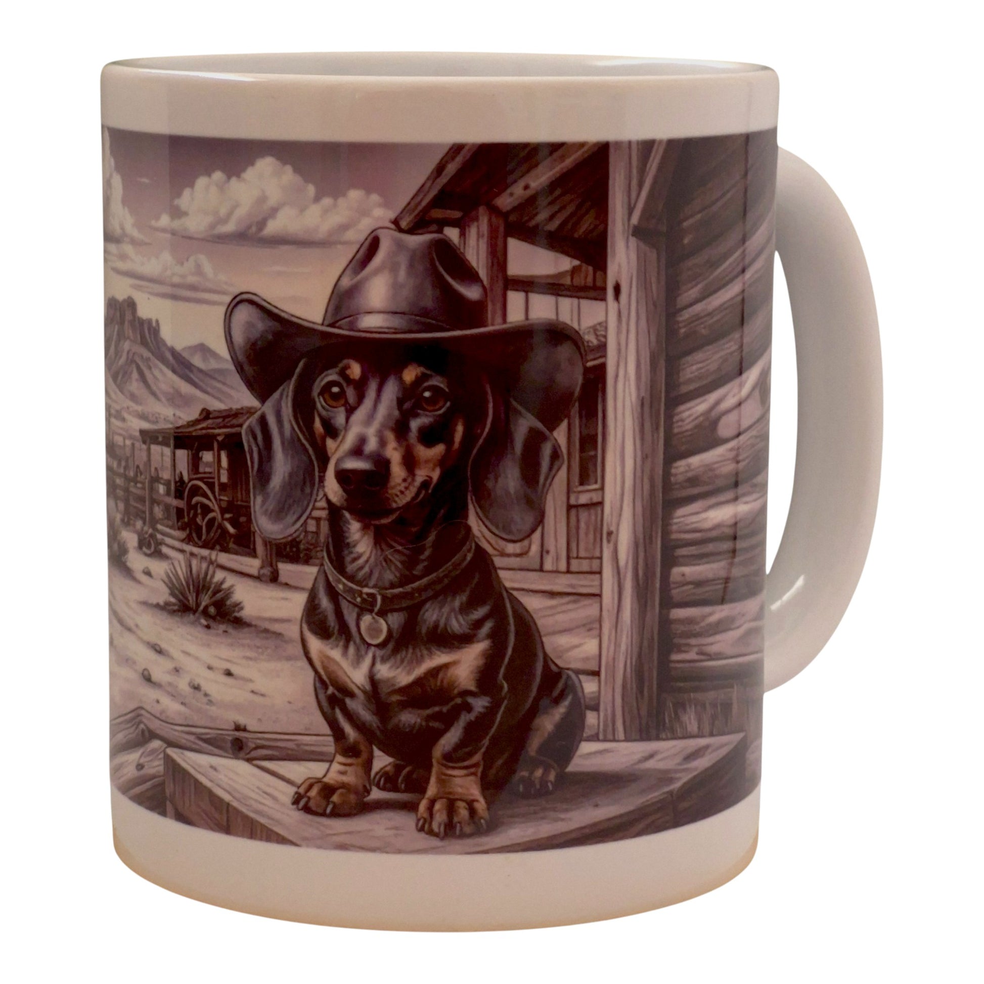 Ez a prémium minőségű bögre igazi különlegesség: elegáns, kraft díszdobozban érkezik, sötétzöld szalaggal átkötve – így azonnal ajándékozható. A bögrén részletgazdag tacskó illusztráció látható westwrn háttérrel, ami egyedi és barátságos megjelenést ad.