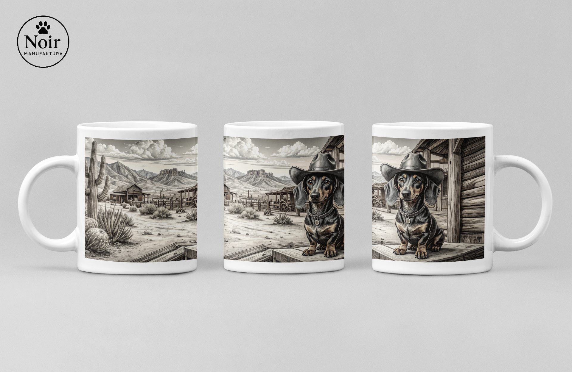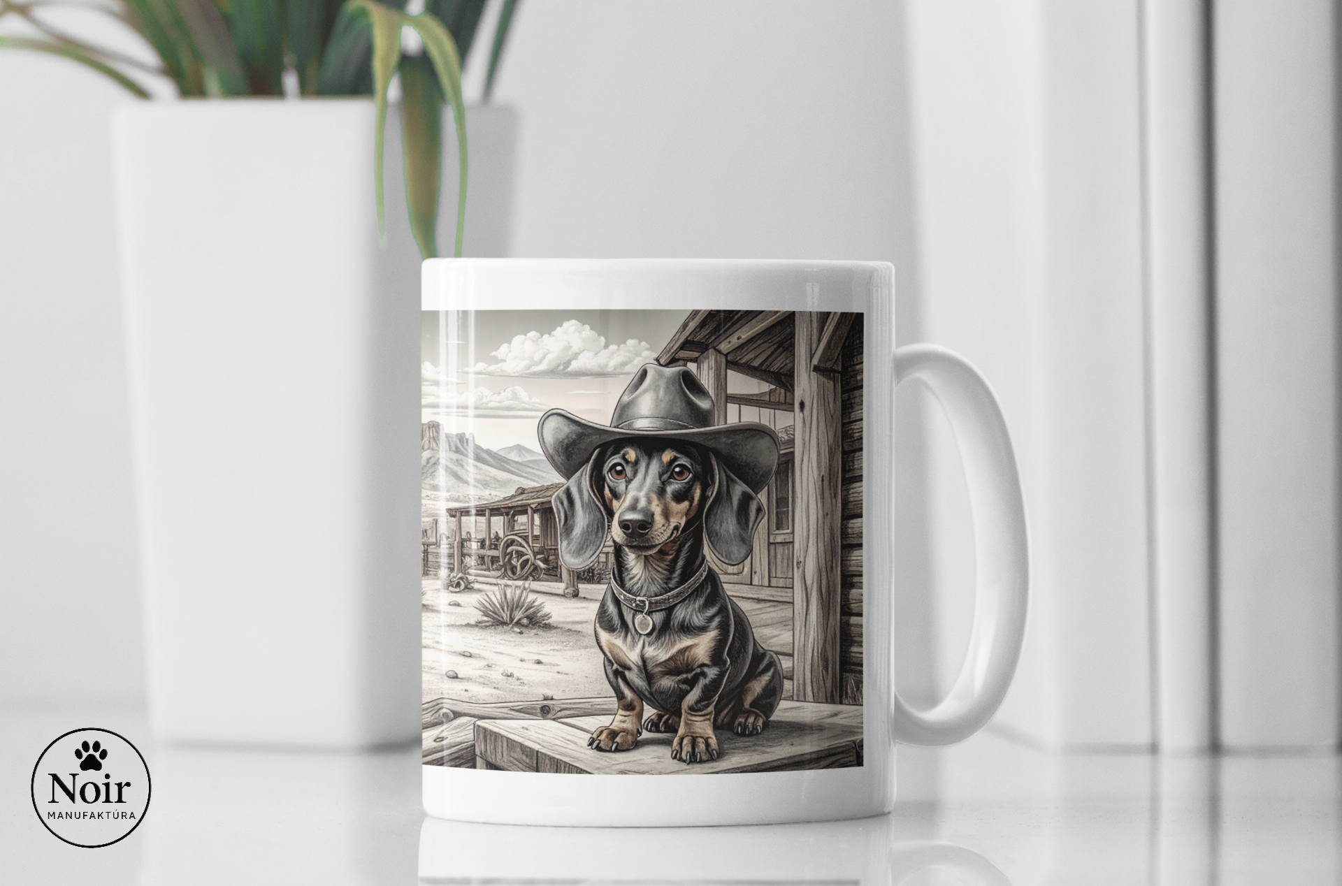 Ez a prémium minőségű bögre igazi különlegesség! A bögrén részletgazdag tacskó illusztráció látható westwrn háttérrel, ami egyedi és barátságos megjelenést ad.