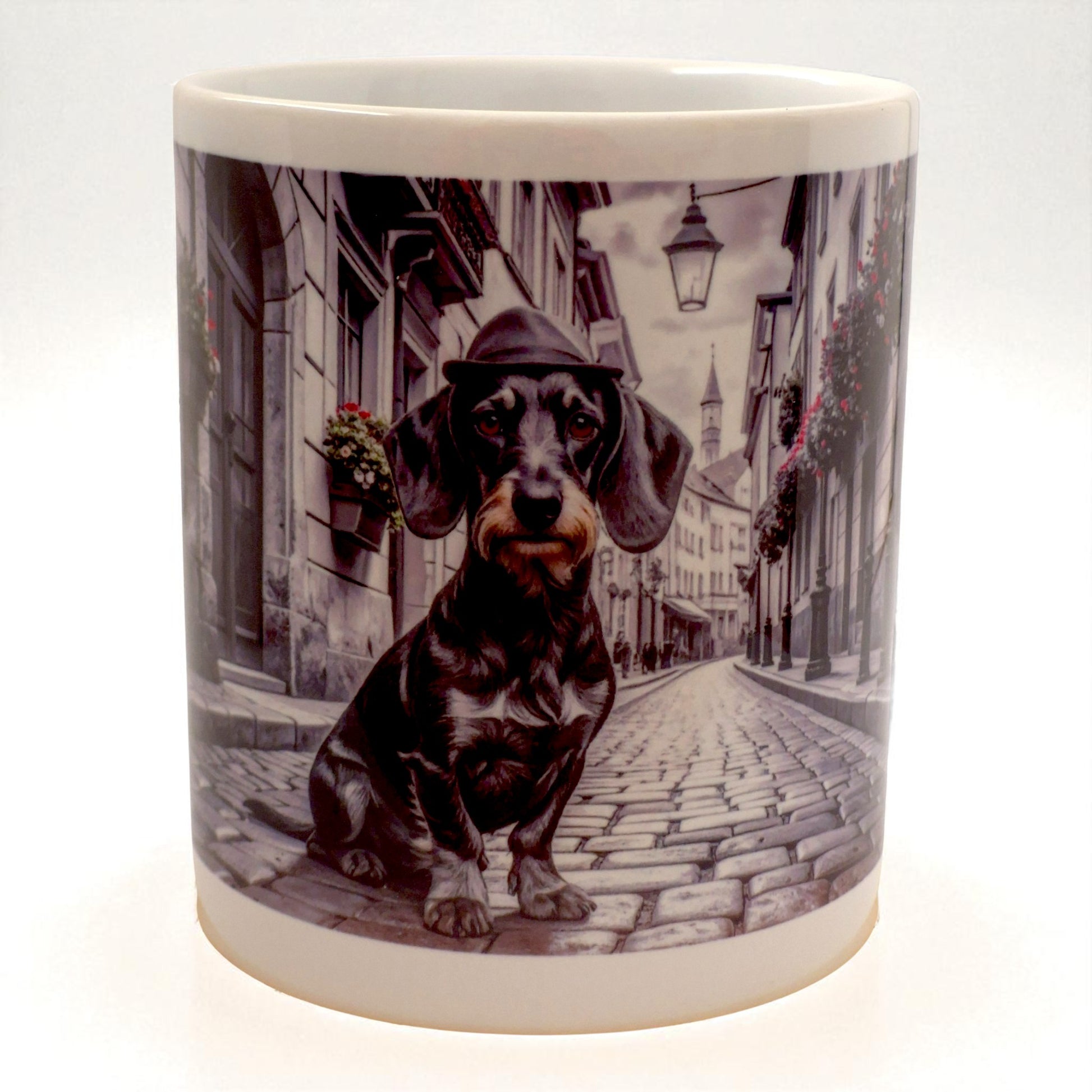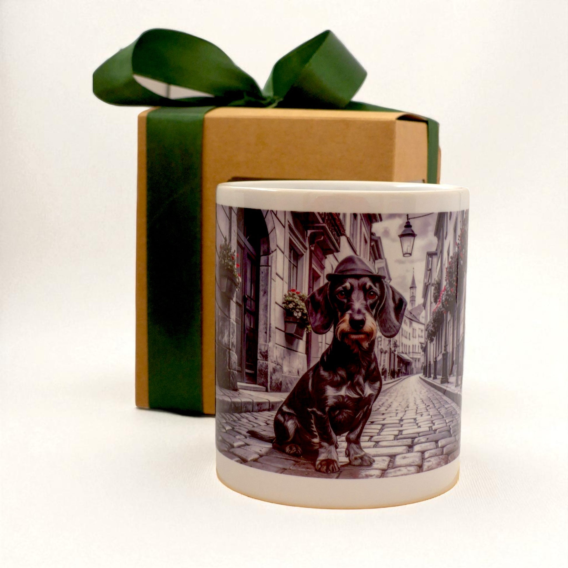 Ez a prémium minőségű bögre igazi különlegesség: elegáns, kraft díszdobozban érkezik, sötétzöld szalaggal átkötve – így azonnal ajándékozható. A bögrén részletgazdag tacskó illusztráció látható egy hangulatos városi háttérrel, ami egyedi és barátságos megjelenést ad.