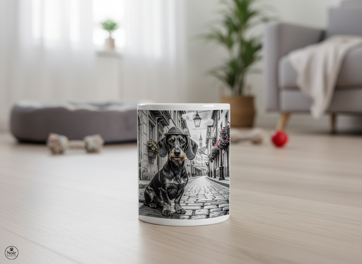 Ez a prémium minőségű tacskós bögre igazi különlegesség! A bögrén részletgazdag tacskó illusztráció látható egy hangulatos városi háttérrel, amely egyedi és barátságos megjelenést kölcsönöz. Tökéletes választás mindennapi használatra, otthonra vagy irodába, valamint kiváló ajándék tacskótartóknak és kutyakedvelőknek.