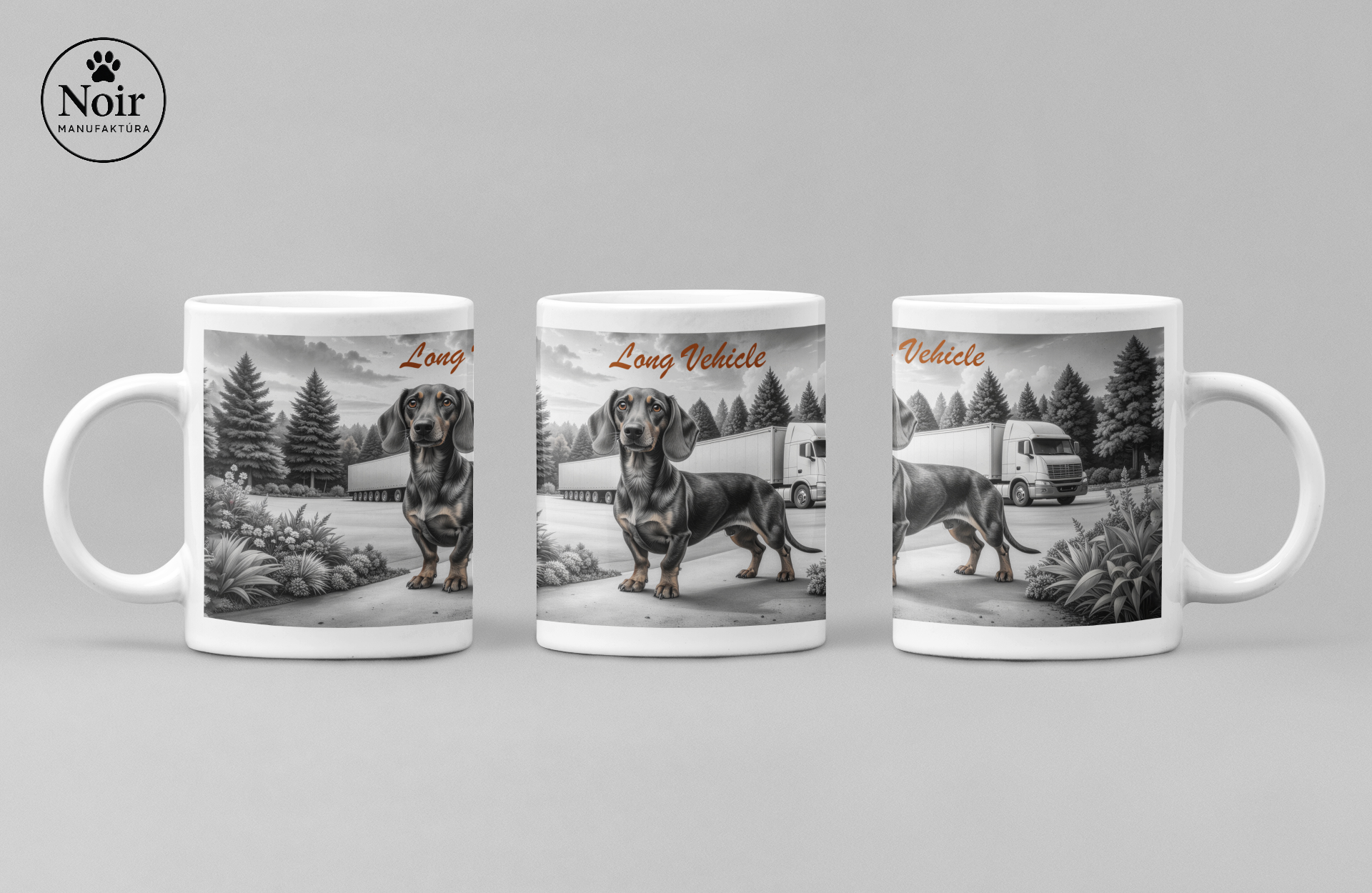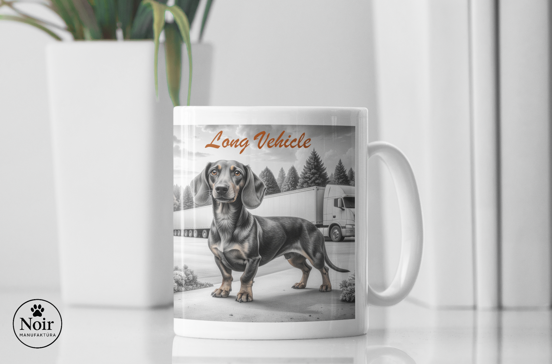 Ez a prémium minőségű bögre igazi különlegesség! A bögrén részletgazdag tacskó illusztráció látható egy kamionos, "long vehicle" felirítos háttérrel, ami egyedi és barátságos megjelenést ad.