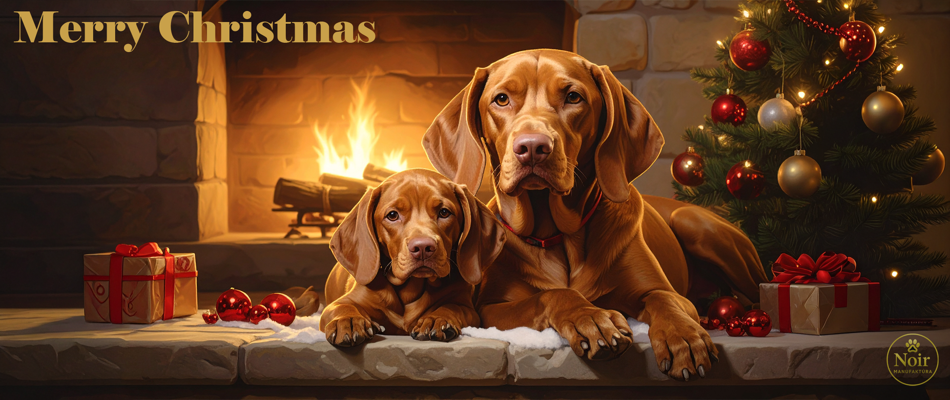 Ezen a prémium minőségű bögrén részletgazdag vizsla illusztráció látható egy hangulatos karácsonyi háttérrel, ami egyedi és barátságos megjelenést ad.