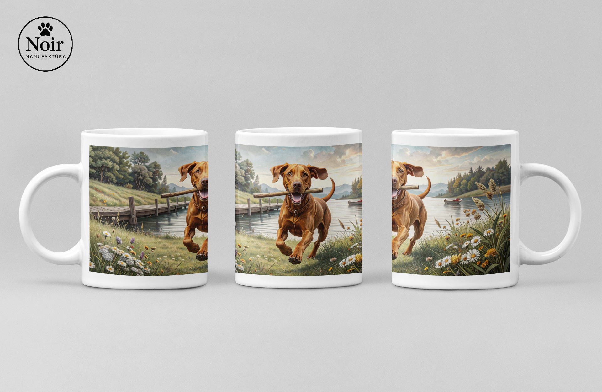 Ezen a prémium minőségű bögrén részletgazdag vizsla illusztráció látható egy szép rétet ábrázoló háttérrel, ami egyedi és barátságos megjelenést ad.