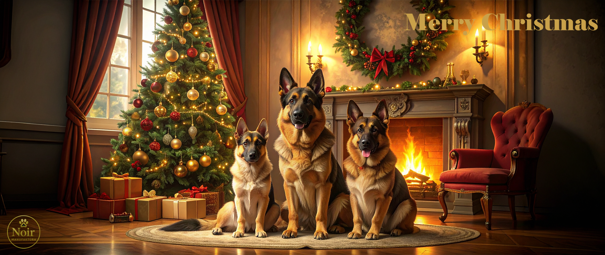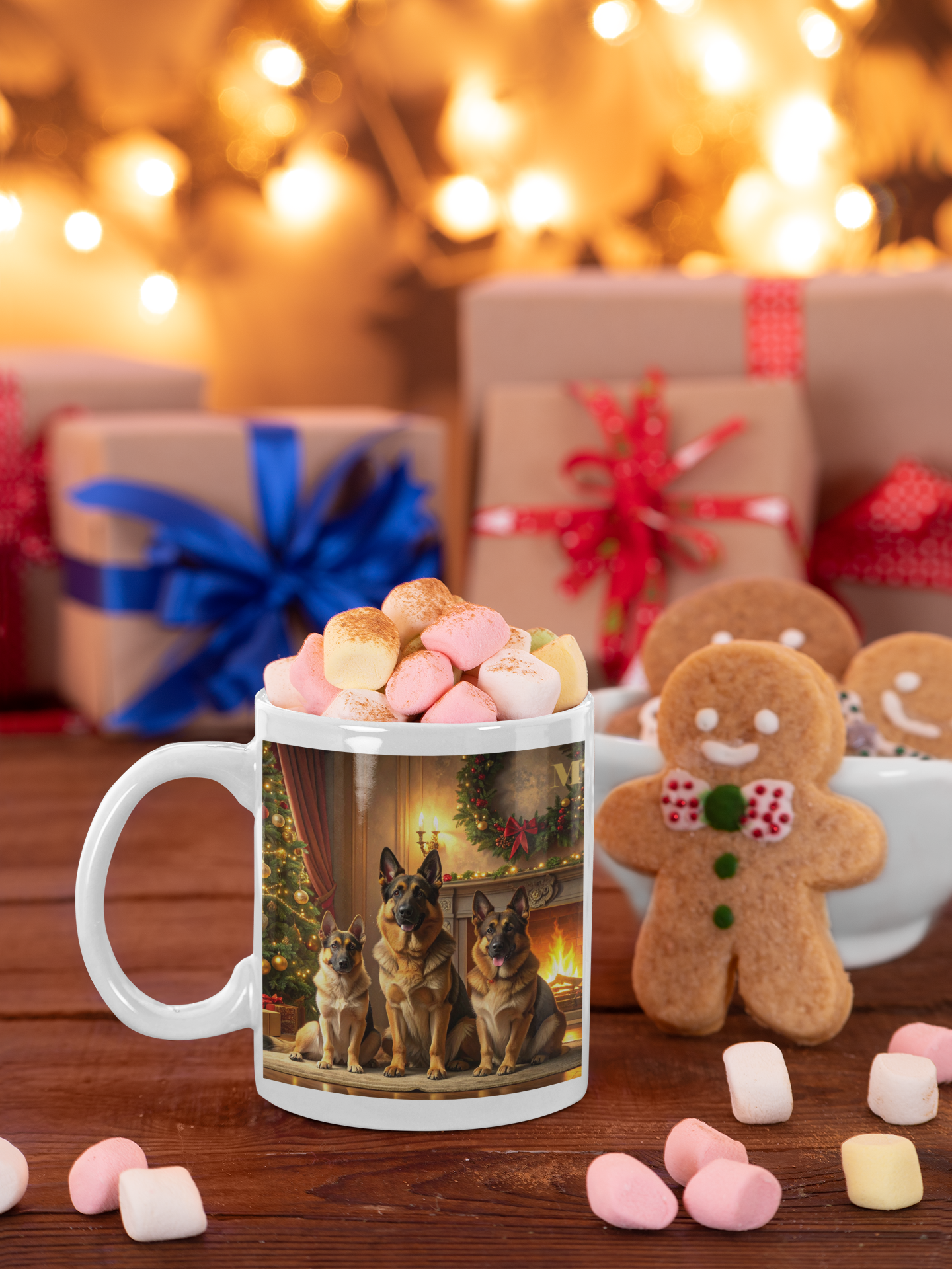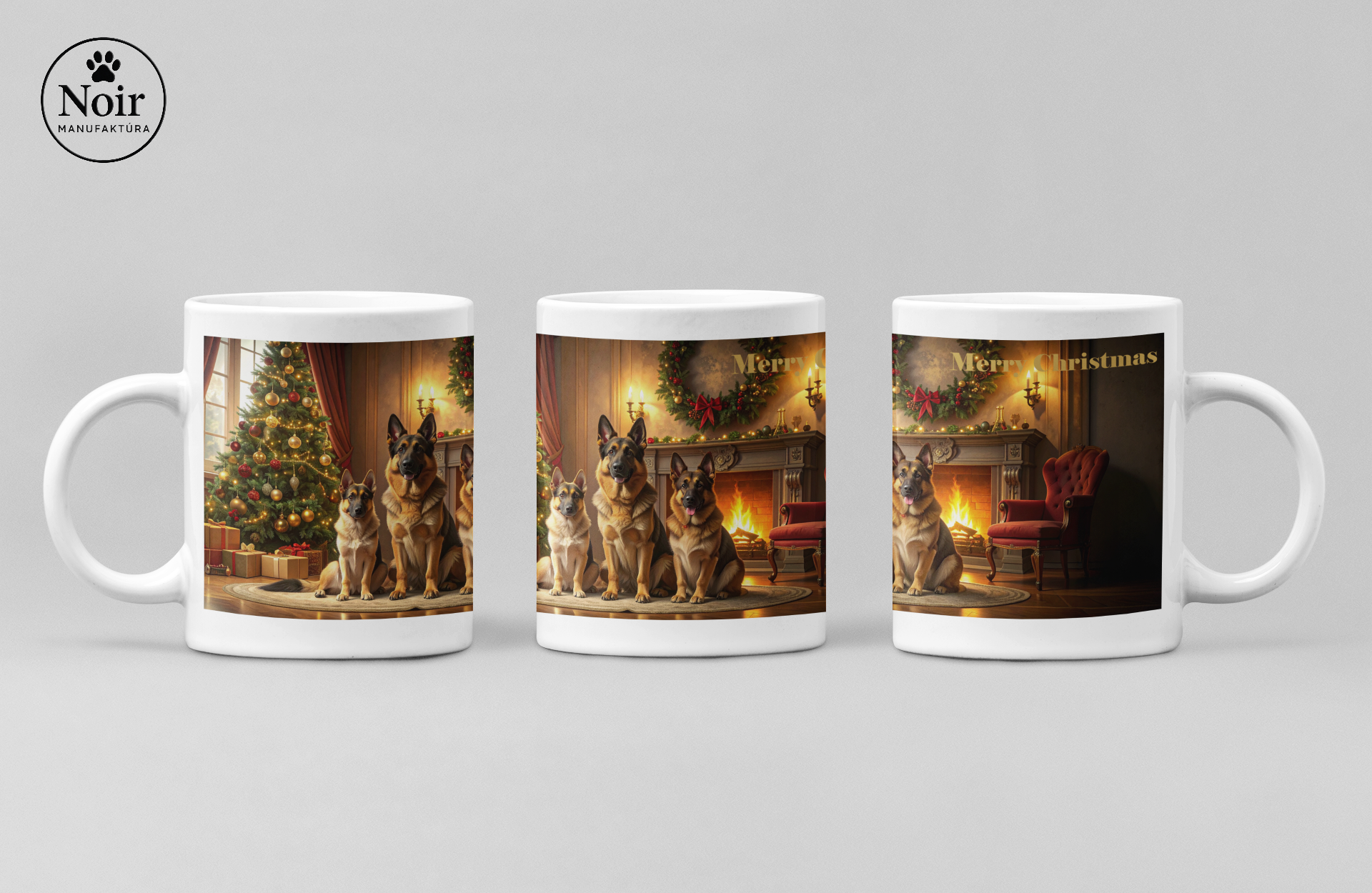 Ezen a prémium minőségű bögrén részletgazdag Németjuhász illusztráció látható egy hangulatos karácsonyi háttérrel, ami egyedi és barátságos megjelenést ad.